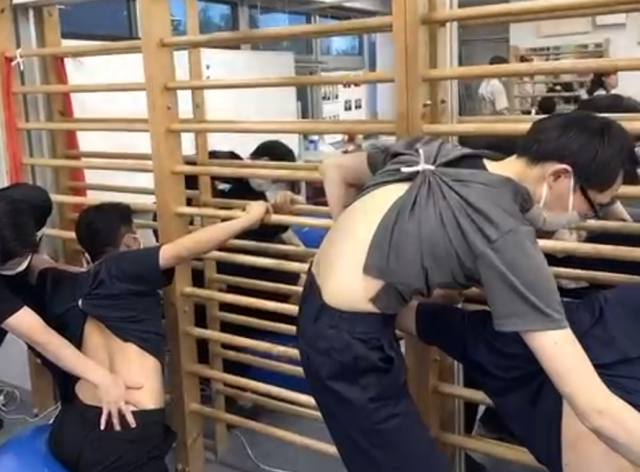 広いトレーニングスペースで姿勢や歩行分析